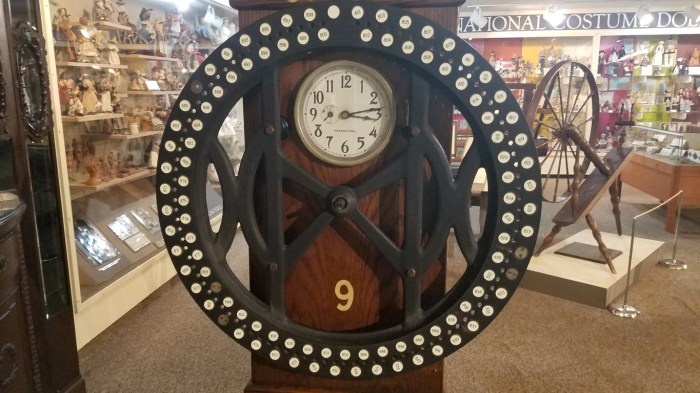 Time Recorder invented in 1888. To record an employees starting and stopping time, they positioned a pivoted pointer arm around to their own number, and pressed it into a guide hole thereby printing the exact time next to their number onto a shehet of paper on the inside and ringing a bell with each punch. This time recorder does not have its pivoted pointer arm.