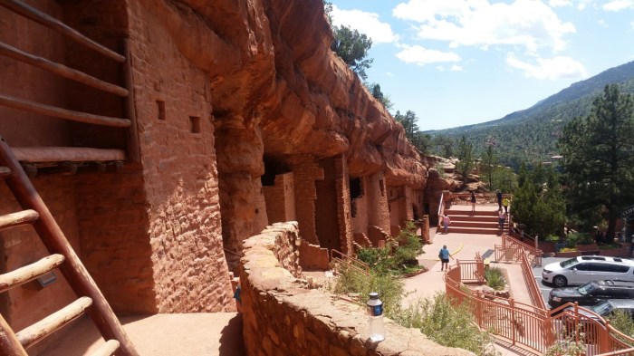 1904 and was completed in 1907. The ruins from McElmo Canyon were collected, packaged, and moved by oxen to Dolores, Colorado. There, they were loaded and shipped by railroad to Colorado Springs, and finally brought to Cliff Canyon by horse and wagon. The workmen then faithfully reassembled the dwellings in dimension and appearance to those in the four corners region. They used a concrete mortar in 1907 as opposed to the adobe mud/clay mortar the Anasazi used. This allows individuals to walk inside and tour through the dwellings.