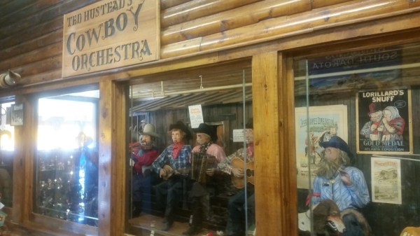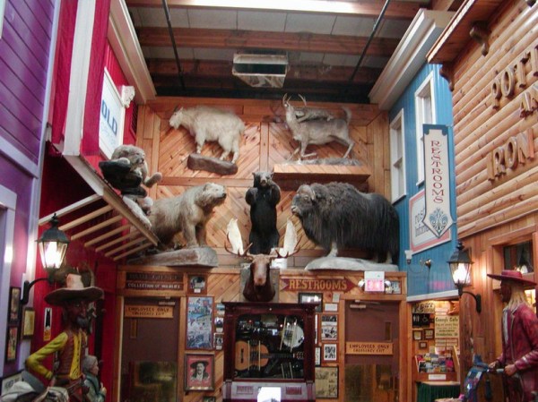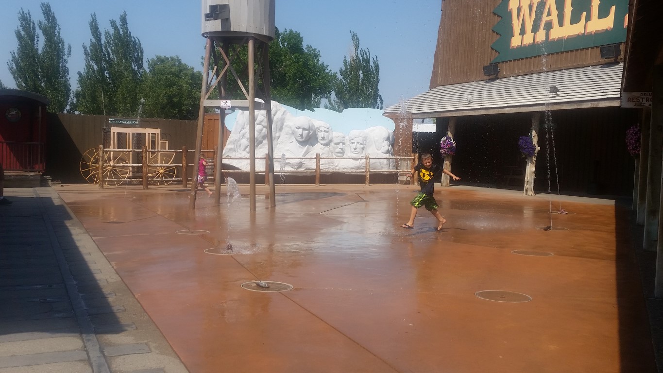 Today, Wall Drug is a dizzying shopping center occupying several blocks of space. Still serving up free ice water and coffee for a nickle, it also boasts many tacky souvenir shops, amusement park like games, a splash park, 400 seat restaurant (where you can order Buffalo and something delicious called Sour Cream and Raisin pie), a chapel where weary travelers can worship, and a six foot jackalope (that’s what I’m sitting on in one photo). Those are some of the things you’ll see in the photos below. What Roy’s eating in one photo is a Buffalo burger.