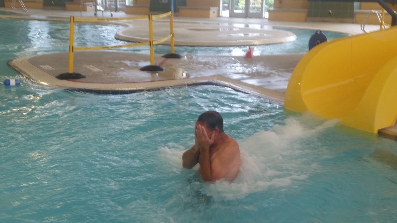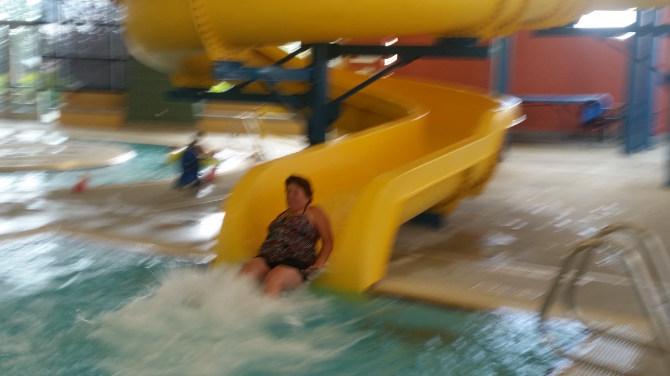 We were the only people in the pool area for a while until a few children non-school age children and their parents showed up. We enjoyed the lazy river and the hot tub a lot. Sue and Lou were both super brave folks who went down the winding water slide like Roy and I did when we were here before.