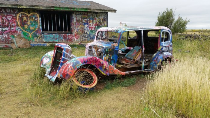 We were the only ones here — you park just off the road and walk over to the cars. A cool abandoned building and older car on property as well.