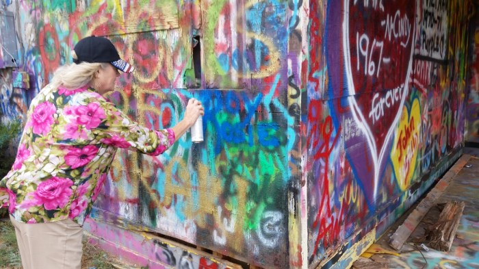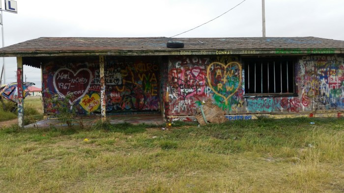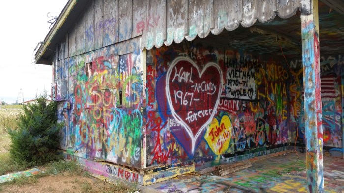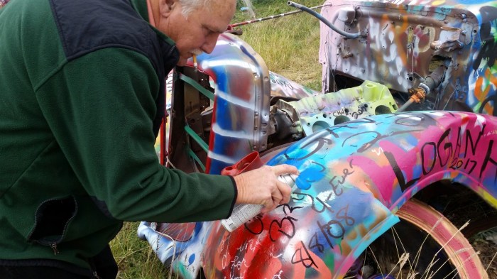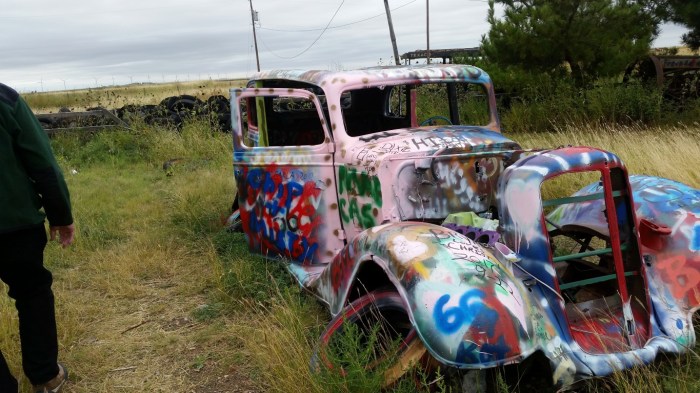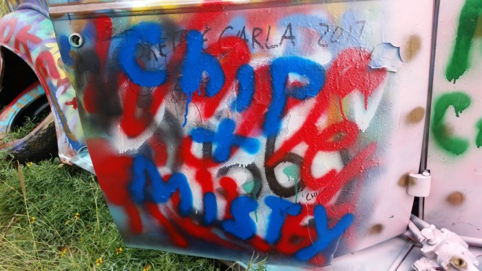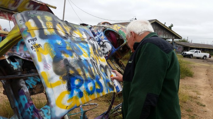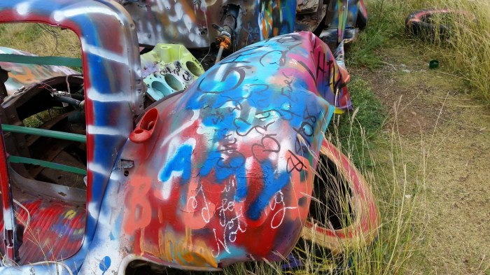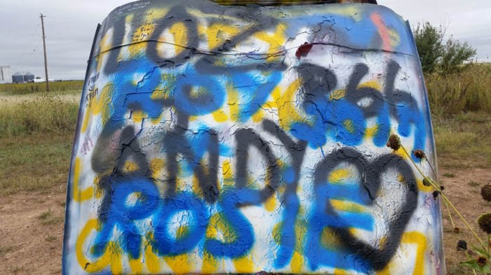 As you look at the pictures in case you can’t tell what we spray painted here’s what it all says: Roy and Rosie 2017, Chip and Misty, our oldest son and wife (whom requested their name not be used), Amite, La (our current hometown). I hope you can tell that we’re not the first people to walk up to these VW bugs and spray graffiti on them. You are encouraged to do that. They are just one of the attractions on Route 66 that people are drawn to. Here they are!