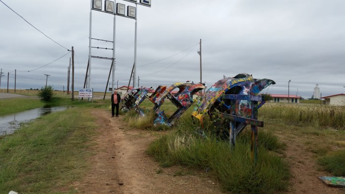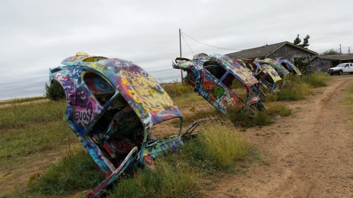 Thursday, September 28, 2017 = Along a stretch of Route 66 east of Amarillo, in Conway, TX you’ll find the quirky VW Slug Bug Ranch, where five Volkswagen Beetles are planted nose-down in the ground—a bookend to the more famous Cadillac Ranch west of Amarillo.