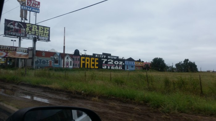 September 29, 2017 – After having lots of fun at the VW Bug Ranch and the Cadillac Ranch in Texas we went to THE BIG TEXAN, home of the famous Free 72 oz Steak if you can eat it all.