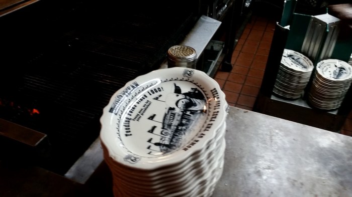 All the steaks are cooked in the open. We were sitting right next to it so we got to smell and see all the steaks being cooked. They are served on the BIG TEXAN plates shown below.