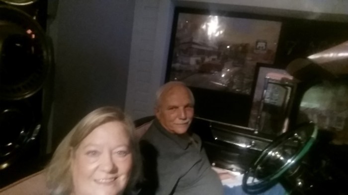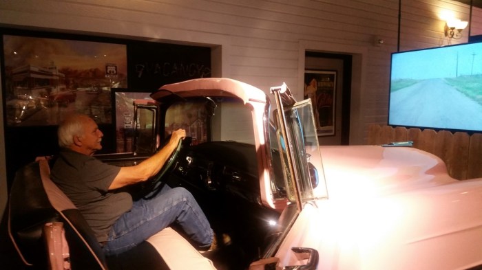 After we paid our $4 (Senior) entry fee and looked around a gift shop, I see Roy climbing into a pink 1955 Cadillac! For the last month we’ve seen lots of old cars and they all said “Do not touch or climb in.” I thought Roy had lost his mind and tried to get him to get out! Then I realize there is a sign that says “Step on the gas and watch a video of going down Route 66 in this Cadillac.” Something like that.