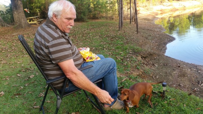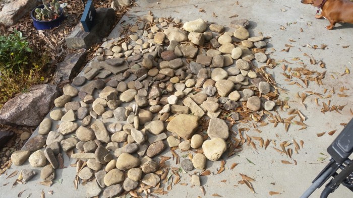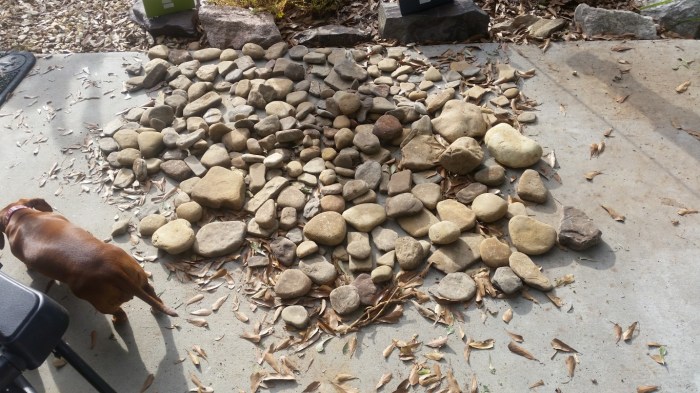 Remember the rocks we got from the creek in Arkansas. This is them on the patio at home. That’s our neighbors dachshund, Snookie in the pictures.