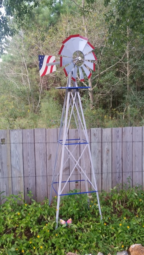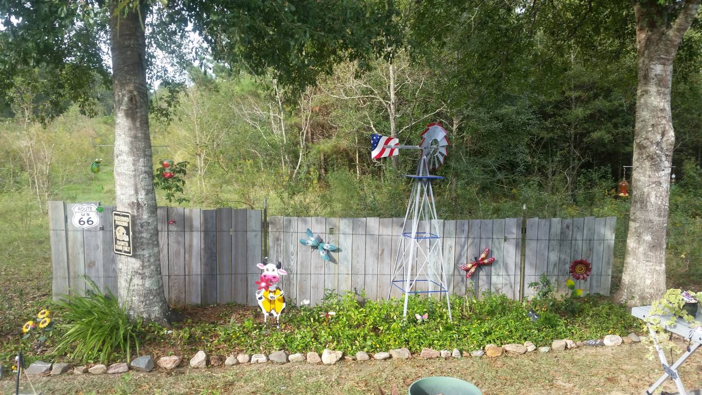 We purchased several metal art objects while we were on the road and last week at the Vintage Marketplace Days in Amite. Chip’s family gave us the big metal flower, I love it! Getting to put them on our fence and in the garden has been fun. Roy put together the wind mill he bought for my birthday in September and it’s in the center of the garden.