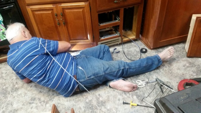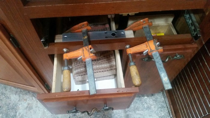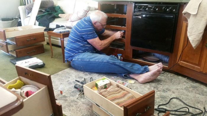 The wiring for the system involved having to remove the toilet in the bathroom to get to the wiring channels that go through the bathroom to the bedroom. Roy spent most of the day Saturday on his stomach on the floor in the bathroom trying to get the bolt lose. After hours of doing this and a trip to the hardware to try other tools to do this he resorted to sawing off the bolt. This man of mine is so McGyver like in times like this. He has big cuts on his arms and elbow and big bruises that make him look like he was beaten. He had to stop before completing the system because we’ve been busy with church, doctors and doctors and now we have a day of rain. The last part he needs to do is to build latches on the bottom of the drawers. We’re taking the toilet out today as part of finishing up the project. I get to scrub it really good and the floor in the bathroom before it gets put back in. That is the absolute least desirable thing I could plan today but if he can lay on his stomach in the bathroom I can scrub the toilet outside.