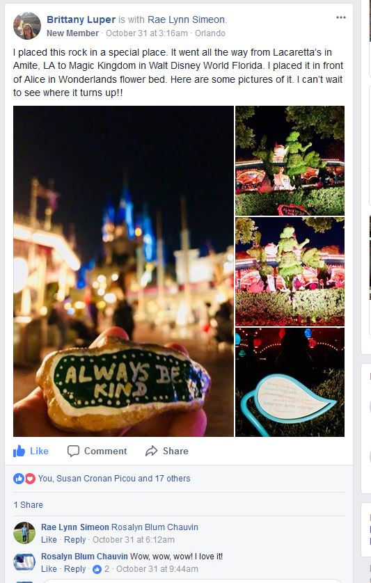 I now have a new table outside where I do my rock painting. Lots of rocks were painted pumpkin orange and hid around this area! I’m working on Thanksgiving rocks now. Lots of things to give thanks for! We ate at LaCaretta in Amite last week and hid some rocks there (like we do everywhere we go!). One of the rocks “Always Be Kind” was found and made it’s way to Disneyworld in the Alice in Wonderland area.