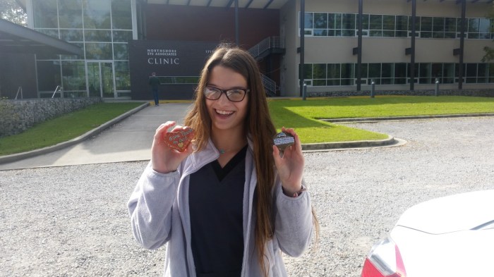 Roy had his OCT test this week at Dr. Greiner. While we were there I got to meet a staff member named Bailey. Last time we were there we hid rocks and she found some and loved it. When I called to make an appointment for Roy the receptionist told me how they loved the rocks we hid. This visit I found that Bailey has two rocks from our last visit sitting on her desk! I told them we hid more outside and Bailey got one while we were seeing the doctor. I offered more to her so she could hide them were she’d like to. She came out to the car with us and said it was okay to take her picture. Here she is!