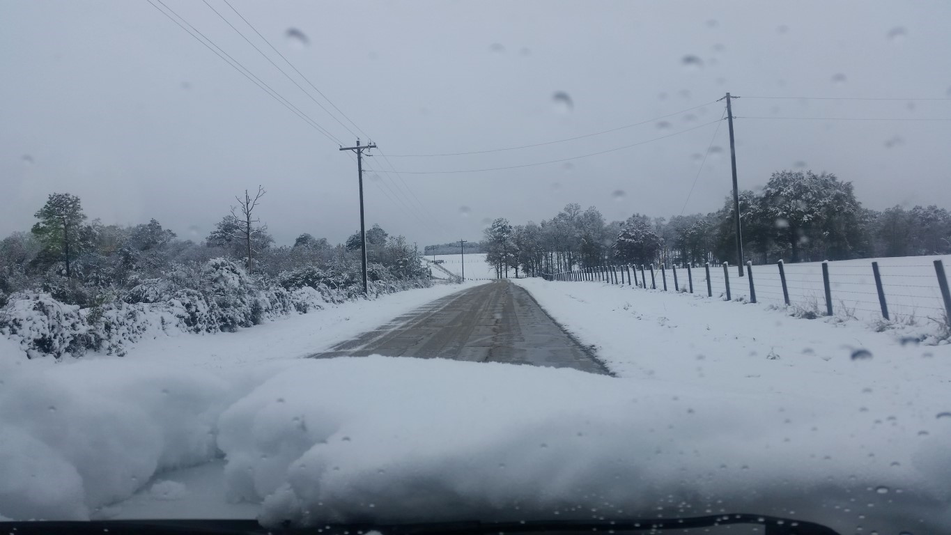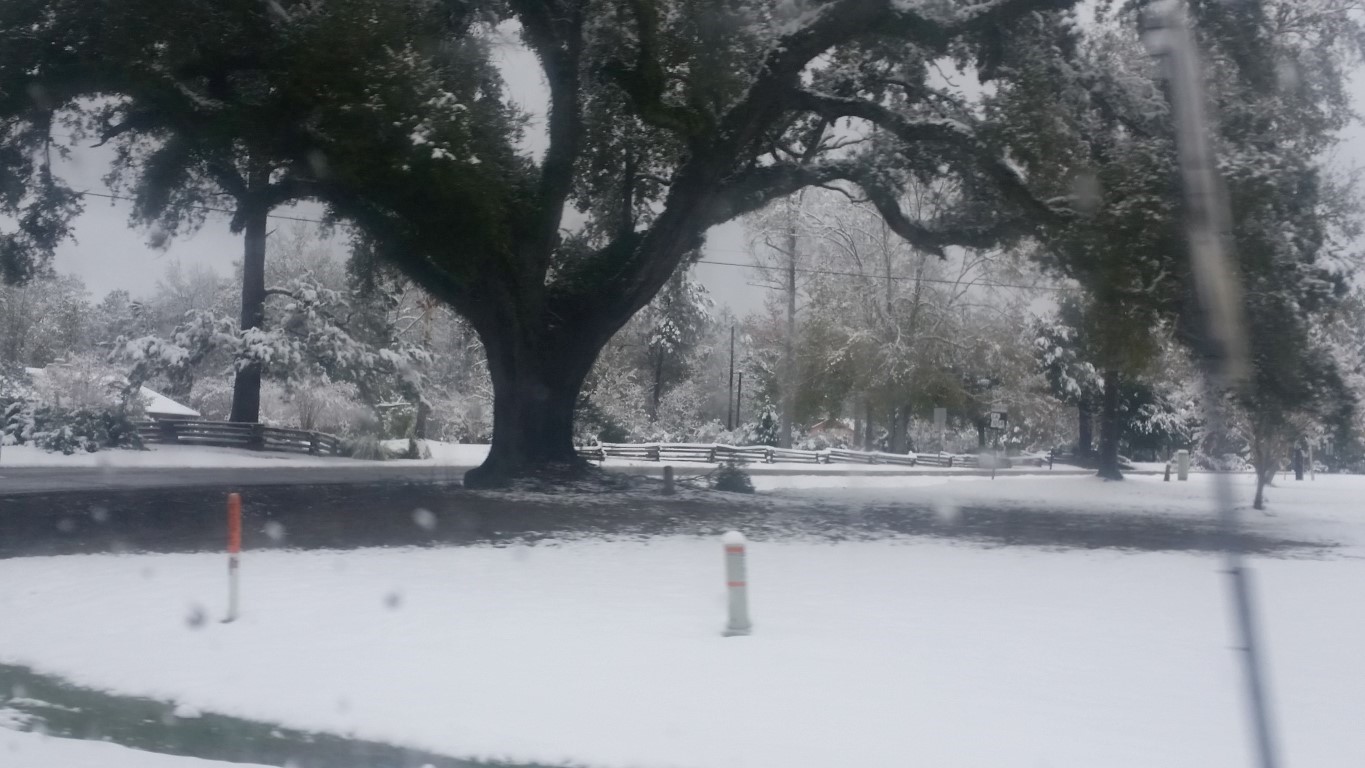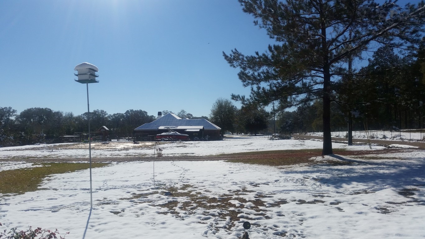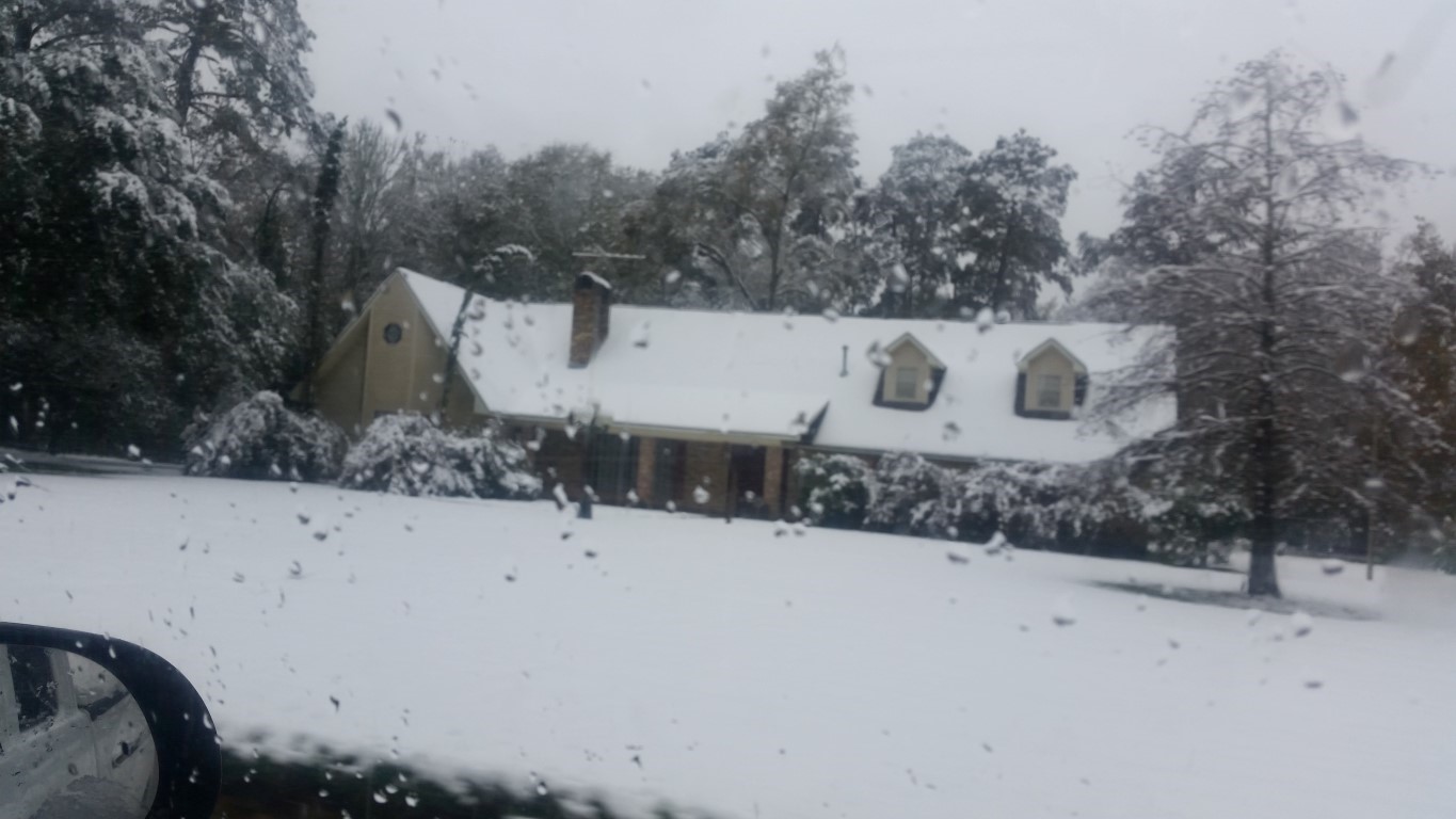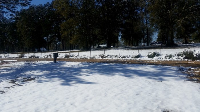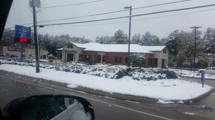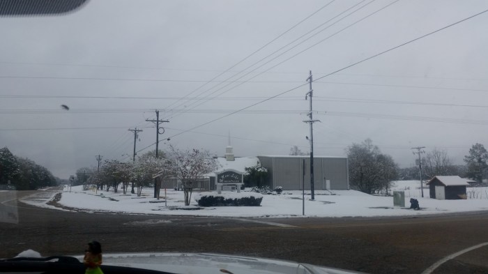 The photos are of our home and pond in Amite, the roads between our home and Interstate 55, then down Interstate 55 and 12 into Hammond and some sights we saw there including our church and Camping World, our son Chip’s home in Ponchatoula and a few pictures this morning now that the snow is just beginning to melt. The temperatures over night were only in the 20s so we got to wake up again to whiteness everywhere!