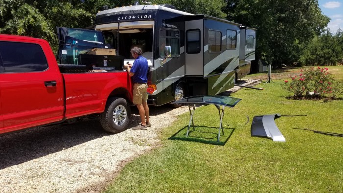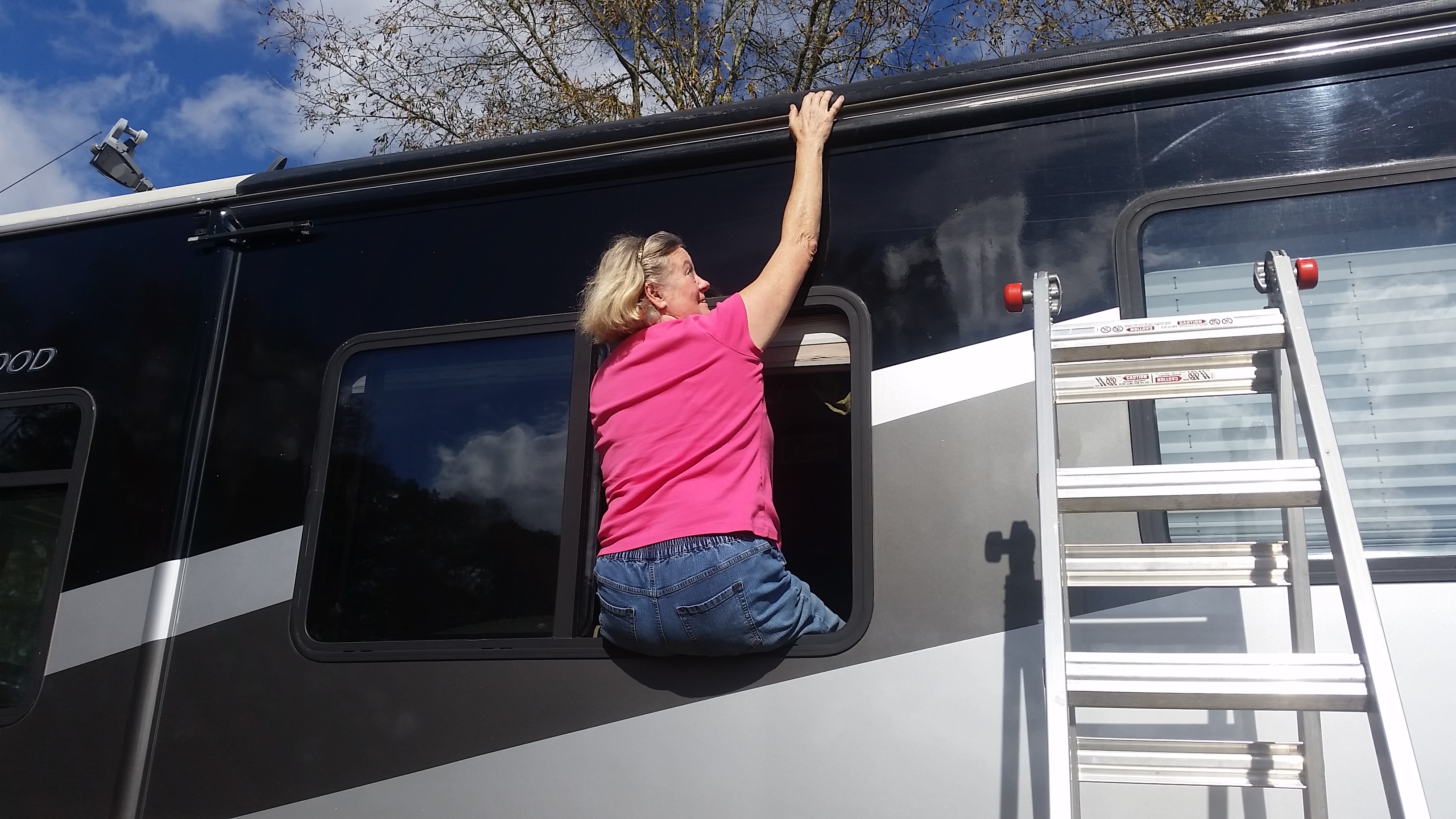 We had a leak in the top of the passenger side slide out in our motor home. Roy worked diligently to fix it and this is me giving a little help!