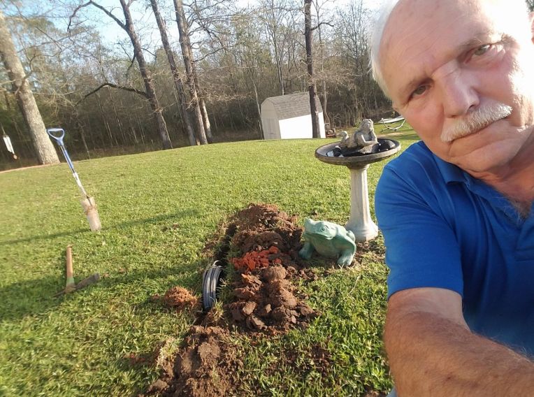 Roy dug a 150 foot trench to our storage building so that we can have lights, an outdoor spotlight aimed towards the pond, and an indoor electrical outlet.