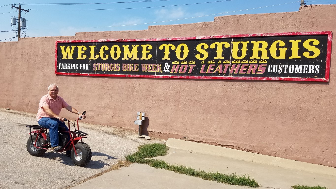 While there we went into Sturgis, South Dakota to see the city famous for their annual motorcycle rally. Roy brought our mini bike with us just so he could take this picture!