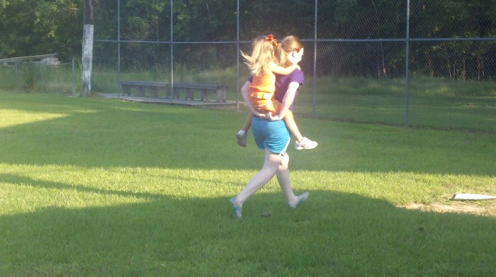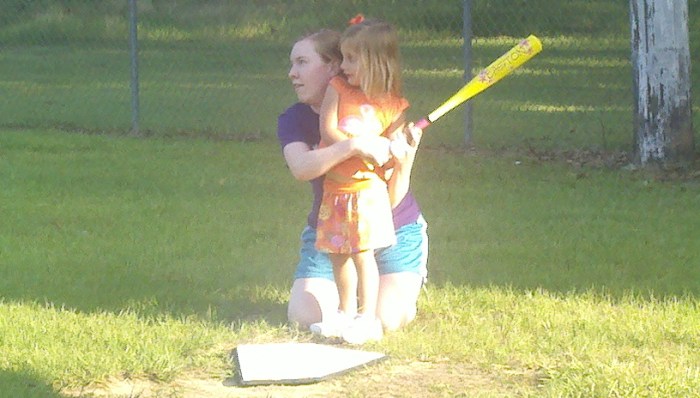 Madisyn wanted to play but she needed a little help rounding the bases. Jeri Bankston, Cat Davis and her daddy Chip took Madisyn on their shoulders or carried her from base to base and she had such a good time!