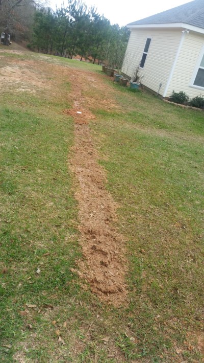 After this photo was taken, Roy installed the new pipe, making sure that everything was set to grade so that the pipes would no longer hold water. He added a couple of new sewer clean out plugs to help with future issues. All the dirt that was dug out was put back and hopefully grass will grow over it soon!