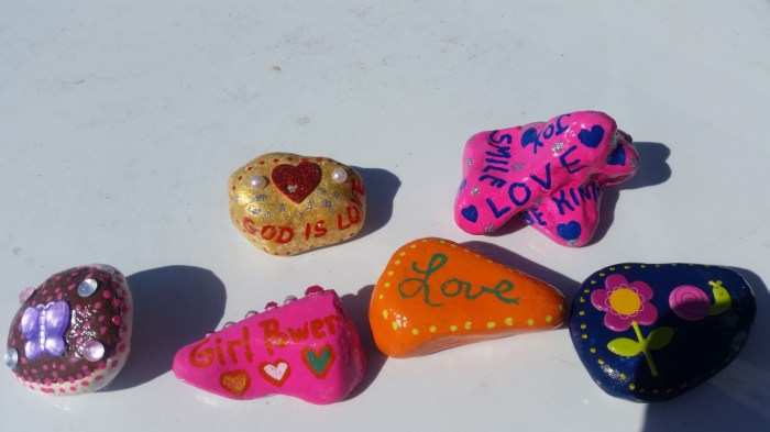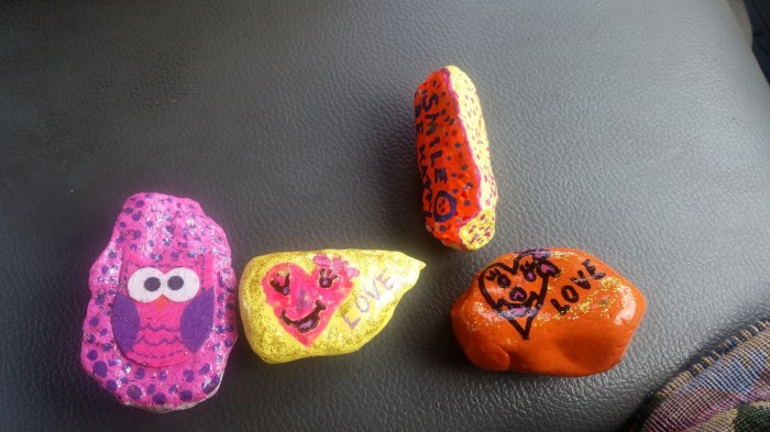 Some of the rocks I painted and hid this month! Three of the rocks in the first photo were done using a technique called paint pouring. These looked okay but I haven’t gotten the hang of that yet.