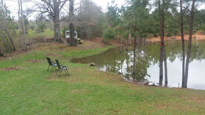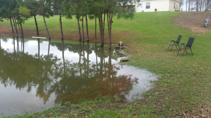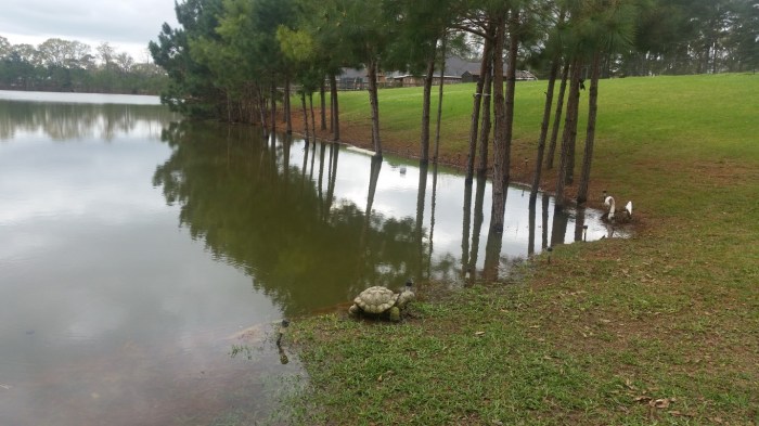 The heavy rains lately have the pond overflowing. The area between the white swan and the concrete turtle is where the culvert is located. We can’t see it at all now.