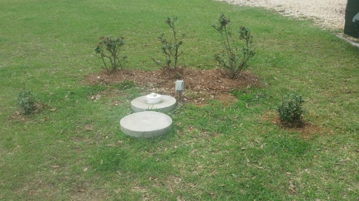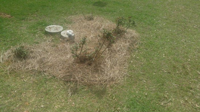 I trimmed back the pampas grass bushes and used some of the stuff I cut off around the rose and bay leaf bushes. There is more cutting to be done on the bushes so this will fill in nicely eventually. Can’t wait till these start to grow again and hide the hideous septic tank covers.