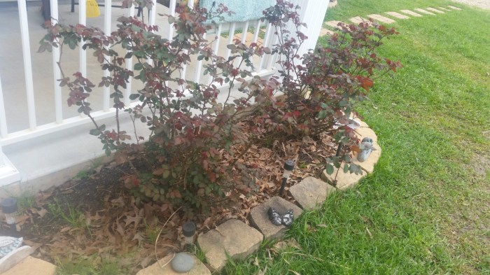 Roy’s mama’s bay leaf plants are not doing well even though Roy has tried several things to help them since we moved here. He dug them up this week and moved them to the front yard near where the rose bushes are planted. They will get full sun there and hopefully grow like they use to. They are the little bushes on the right and left side.