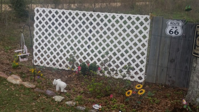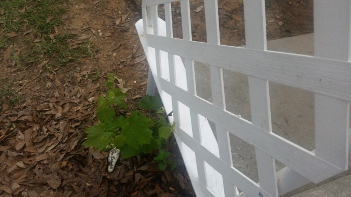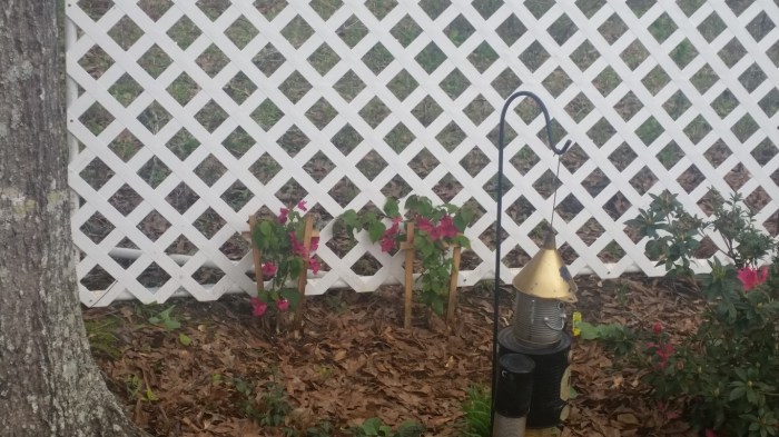 We bought two bougainvillea, one mandevilla and a yellow flowering plant to grow up the lattice fence we put in last week. The green grapes are now planted at the bottom of the lattice arch and they’ve already taken hold and growing upward.