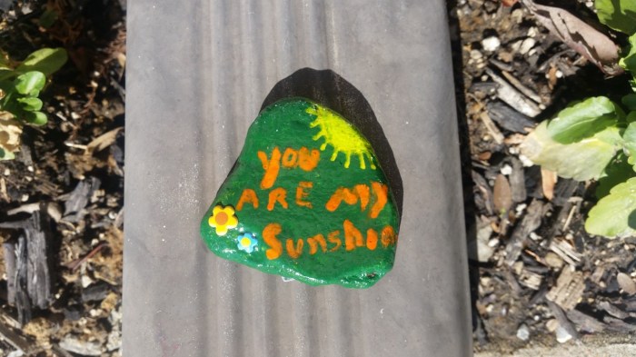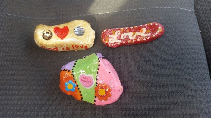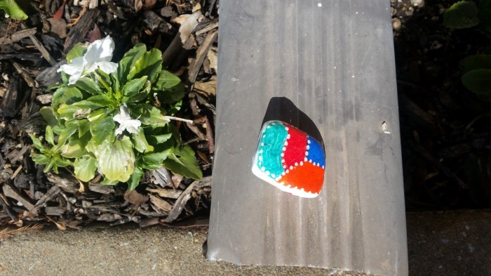 Some of the rocks I painted and hid this month! Three of the rocks in the first photo were done using a technique called paint pouring. These looked okay but I haven’t gotten the hang of that yet.