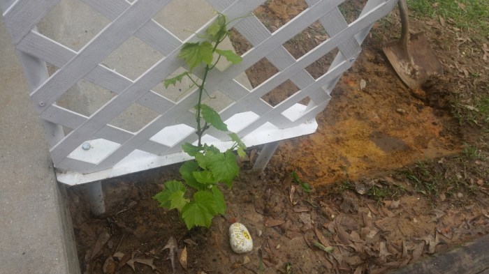 We bought two bougainvillea, one mandevilla and a yellow flowering plant to grow up the lattice fence we put in last week. The green grapes are now planted at the bottom of the lattice arch and they’ve already taken hold and growing upward.