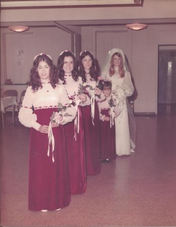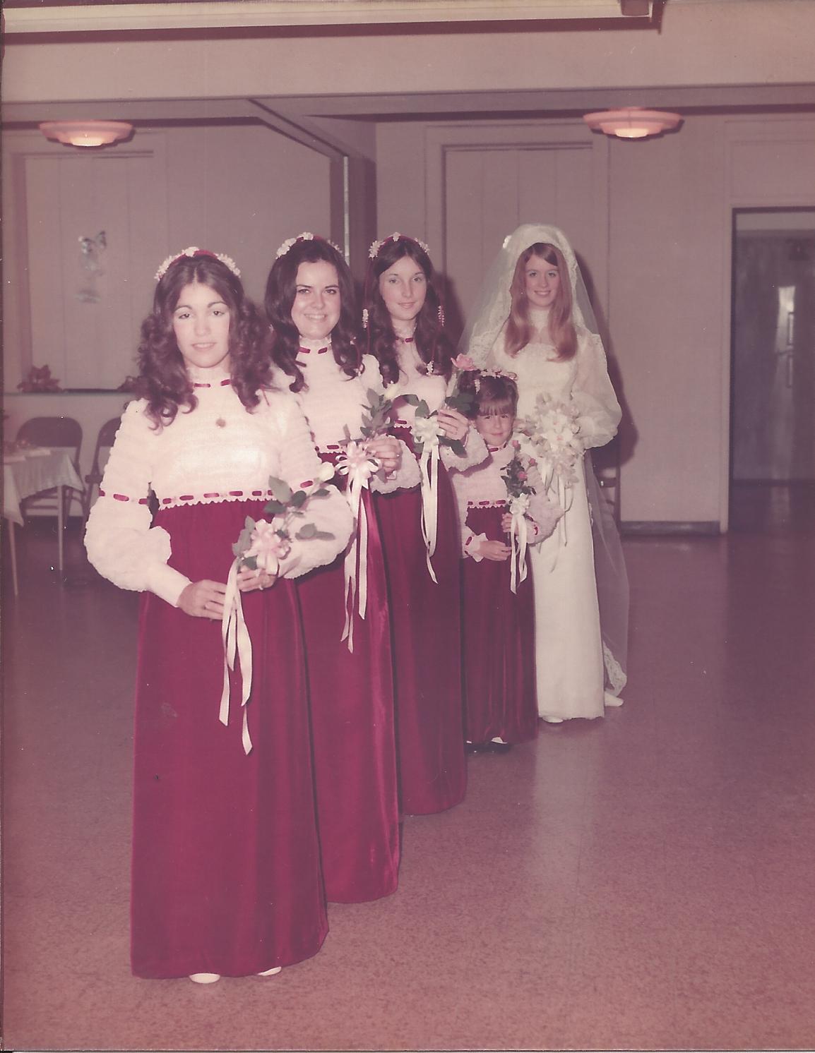 9. The girls in our wedding party in the church’s fellowship hall. Donna Cohn, Brenda Ellis, Colleen Coppenger, Dana Roussel and me!!