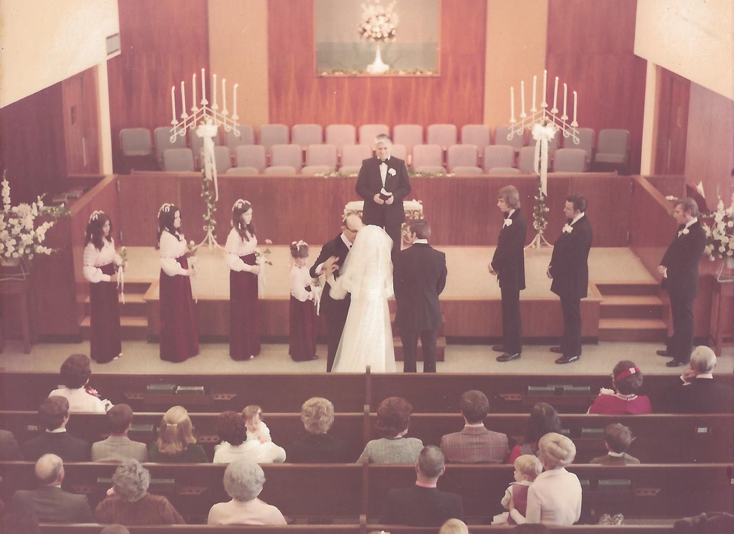10. A photo at our wedding in the sanctuary taken from the second floor. Donna Cohn, Brenda Ellis, Colleen Coppenger, Dana Roussel, Roy and I, Mike Brauninger, Paul Chauvin, Eddie Tate and Rev. J. Richard Randels