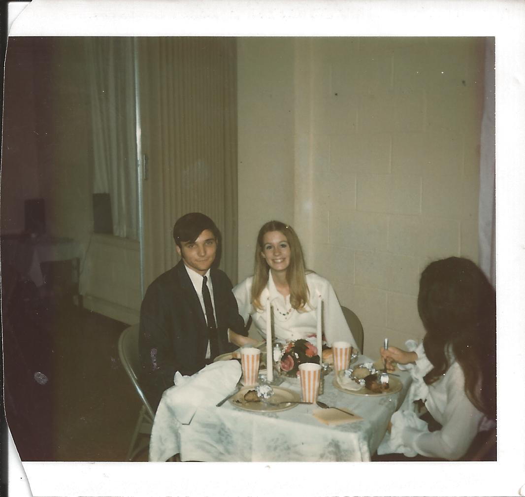 8. Roy and I while we were dating at a Valentine Banquet at church. My best friend Brenda is sitting with us. Her boyfriend must have been taking the photo.