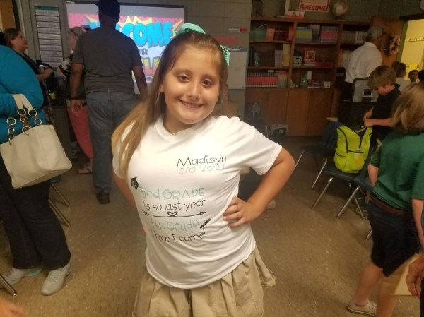Here’s Madisyn after her awards event at school. with Chip and Misty End of third grade and on to fourth! A friend made her the cute shirt in the second picture and the bow to go with it. It says “Third grade is so last year…. 4th grade here I come!!!”