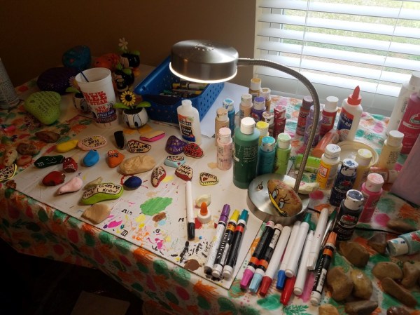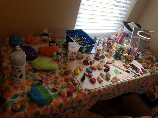 This is my set up for rock painting. Lots of rocks both small and large in various stages of painting!