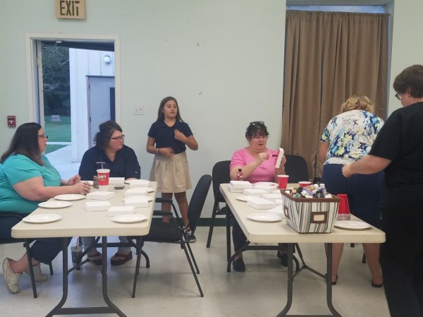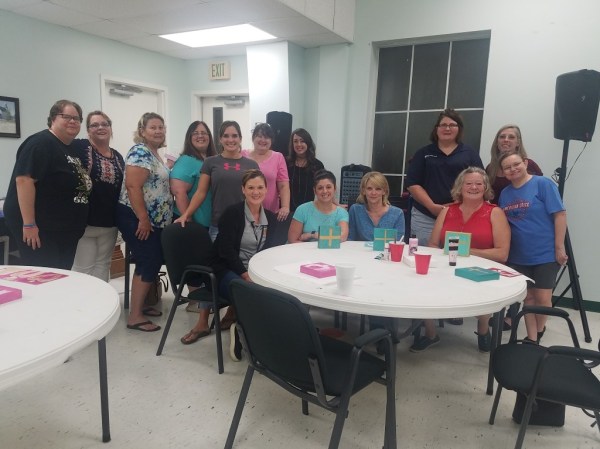 Here’s the ladies who enjoyed this evening together creating cross and angel paintings, even without power for part of the evening! That’s me in the red shirt at the table.