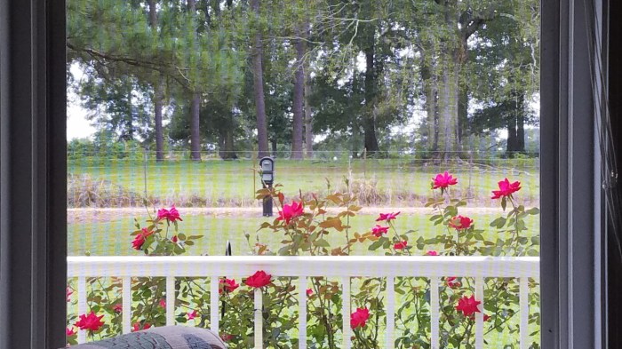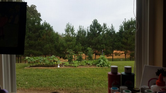 My view of the back yard, pond and garden out the rock painting room window is very special!