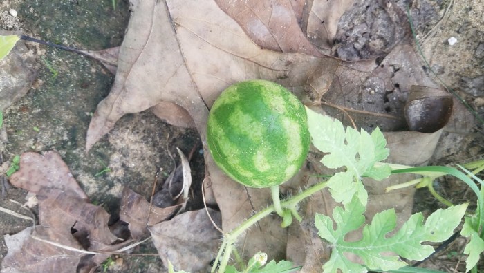 The little watermelons, cantaloupe and peanut garden that is located down the hill near the pond are another learning experience. When the time is right next year we’ll do this again in the same place. Here’s how the watermelons are doing right now. I think they are adorable, just too little to eat yet!