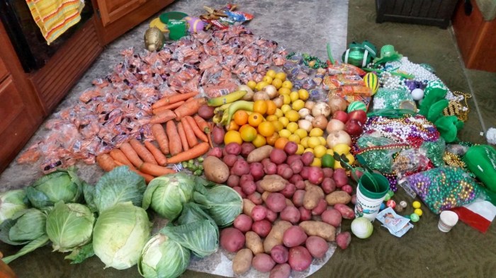 This is all the food we caught! Yes you catch food in our St. Patrick’s day parade. Carrots, cabbage, lemons, potatoes, bananas, onions and garlic!