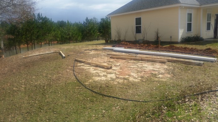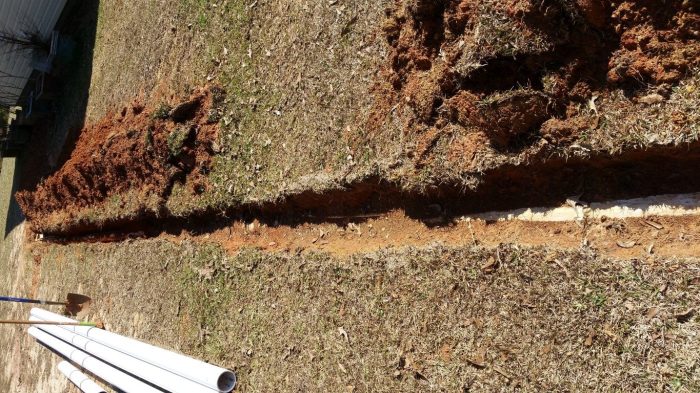 In February 2018 we discovered that the plumbing pipe from the house to the septic tank was not the quality we asked for when the house was being built. That has caused problems for our renters in the past so Roy dug up all of the old not good quality pipe and put down some high quality pipe. This photo shows both pipes.