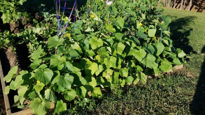 We had freezing weather early in the year so a lot of the garden’s crops were picked early. Good thing because the cucumbers, tomatoes and okra were pitiful looking after the freeze.The photo below was the cucumber vines a week before the freeze.