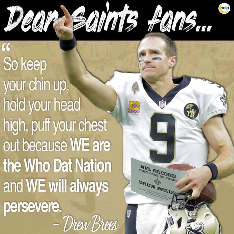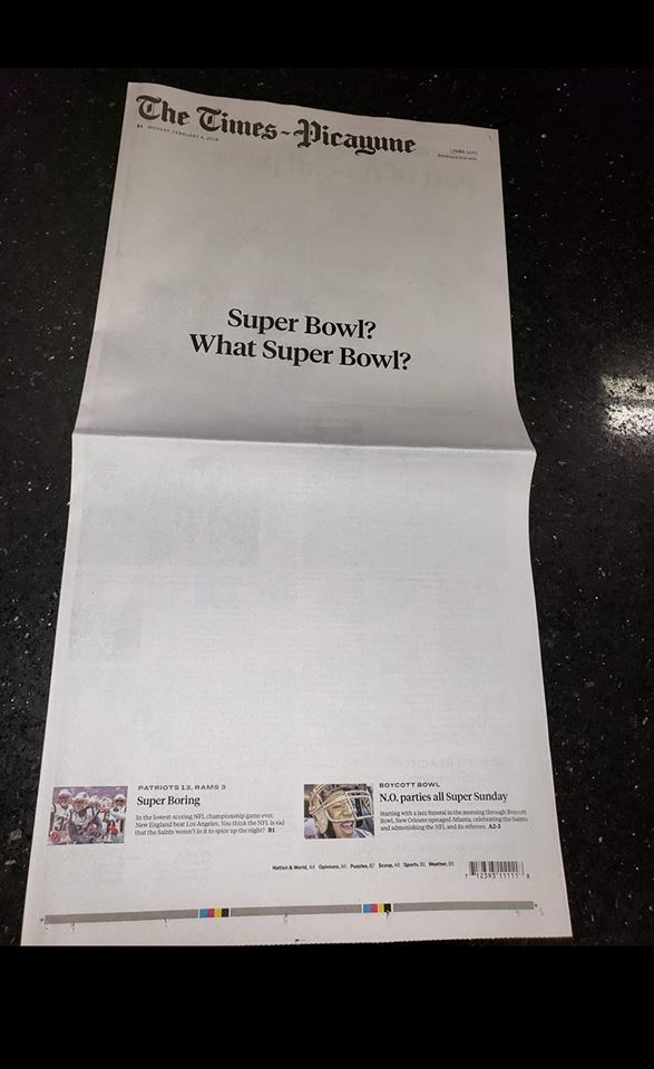Our team, the New Orleans Saints was robbed when referees missed a critical call in the NFC Championship Game versus the Los Angeles Rams. The Rams went to the Super Bowl instead.