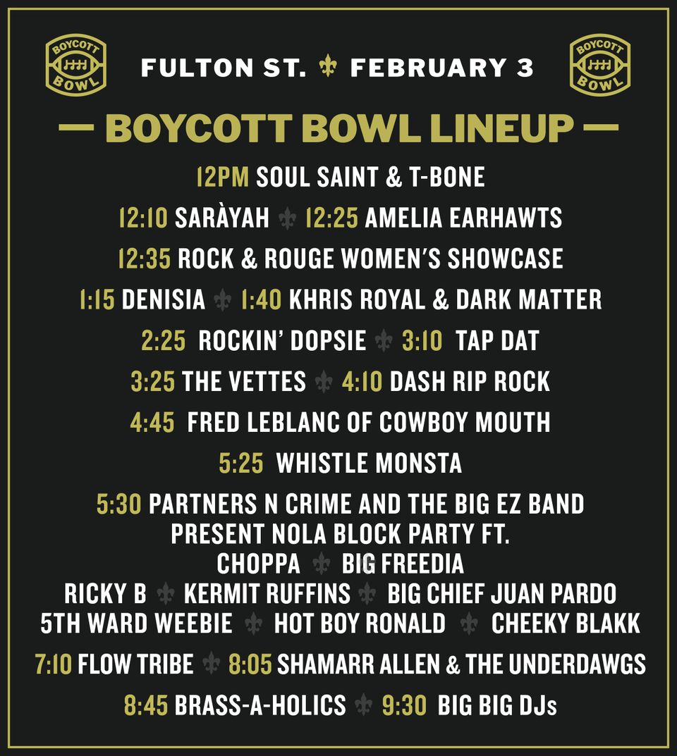 The Boycott Bowl concert took place from noon to 10 p.m. at the intersection of Fulton Street and Lafayette Street. This was the lineup of music.