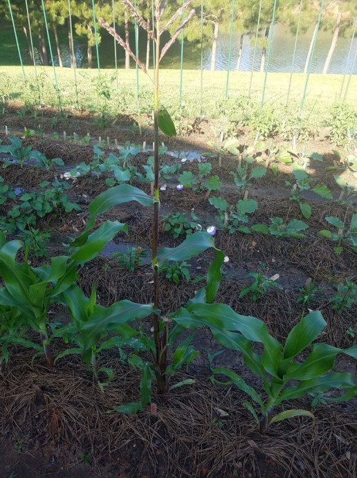 This is the stalk that was started from seed inside and was the only one that lived long enough to be planted outside! The rest of the stalks were seeds planted directly outside so they are a bit behind that one.