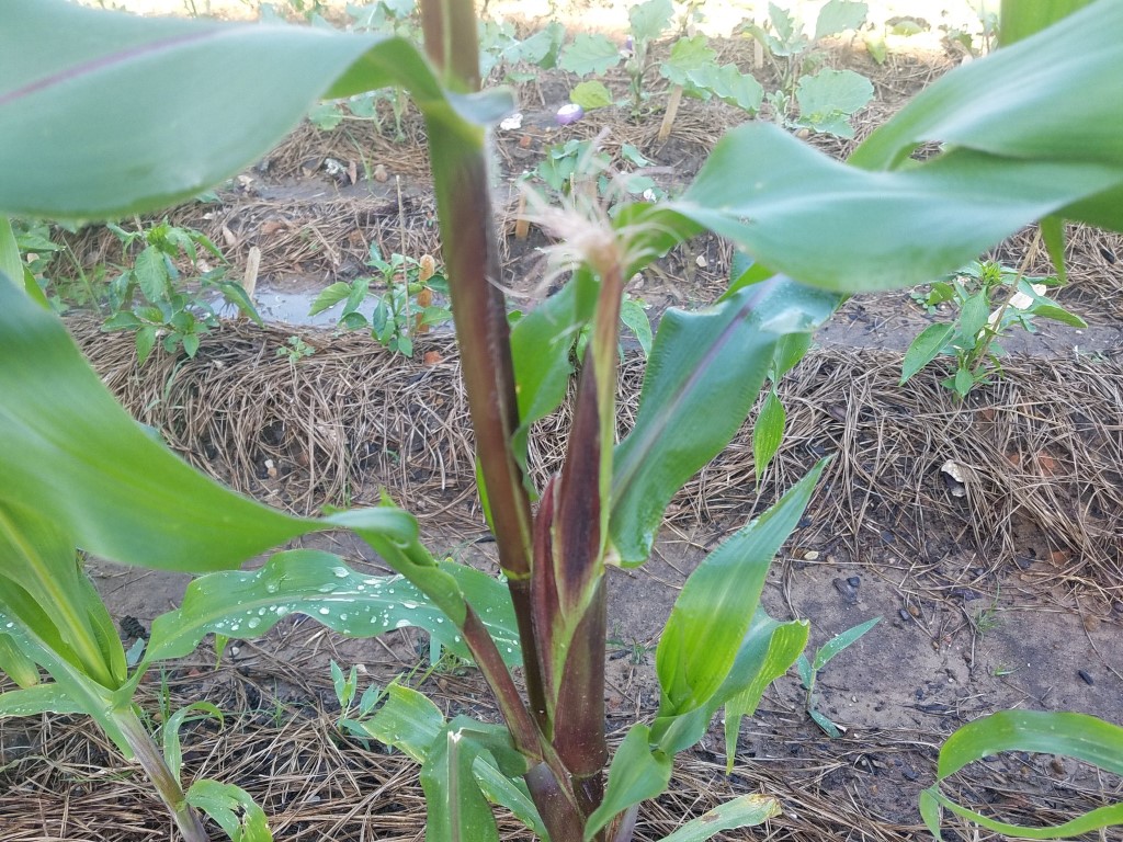 Our tallest stalk of corn is expecting its first baby corn!!! It’s not time for a full vegetable garden update but this new development is too wonderful to wait!
