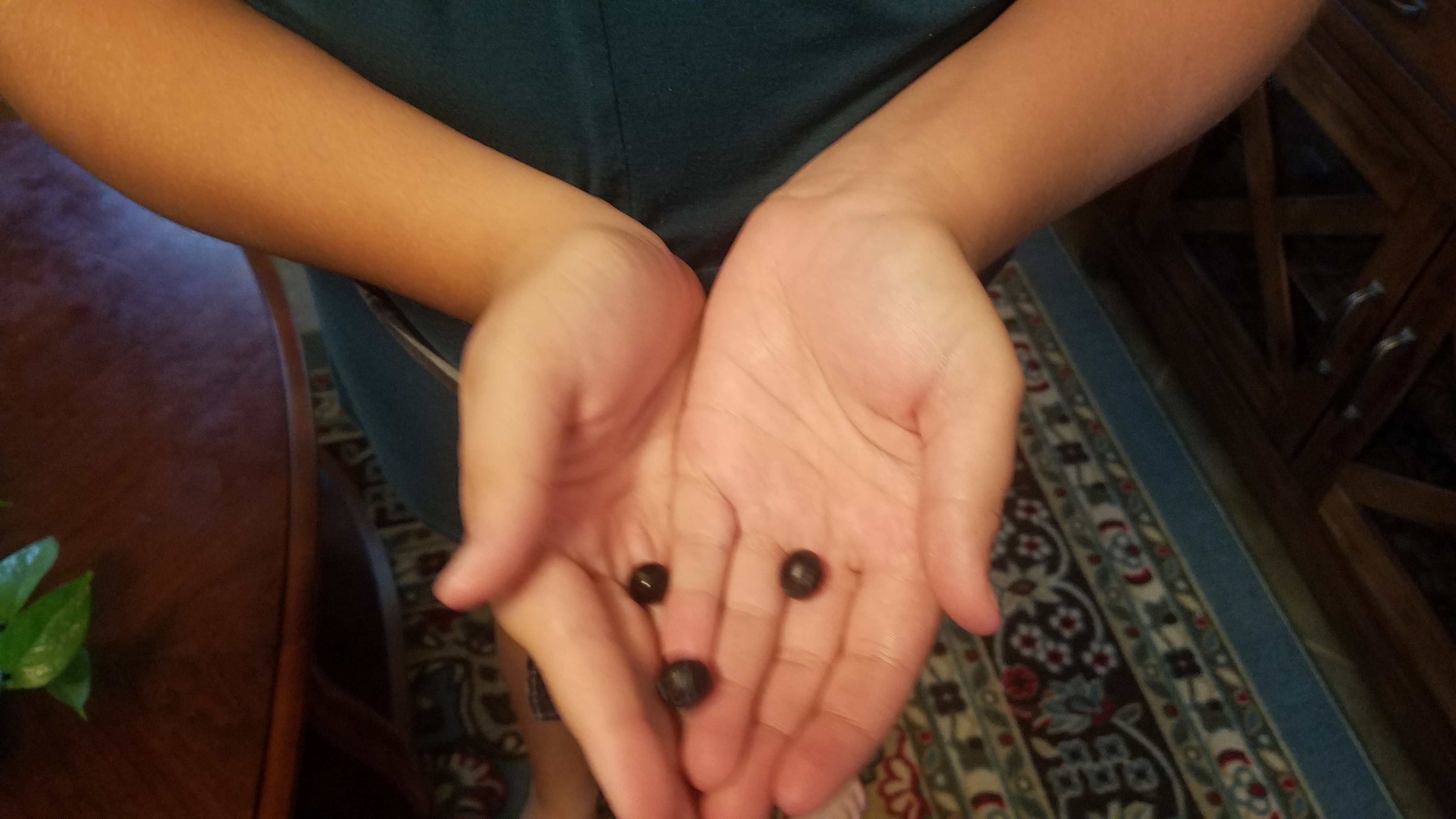 Our eight blueberry bushes were moved this year so we didn’t anticipate much of a crop and that’s what we got. We let Madisyn pick the three blueberries and she shared them with me!