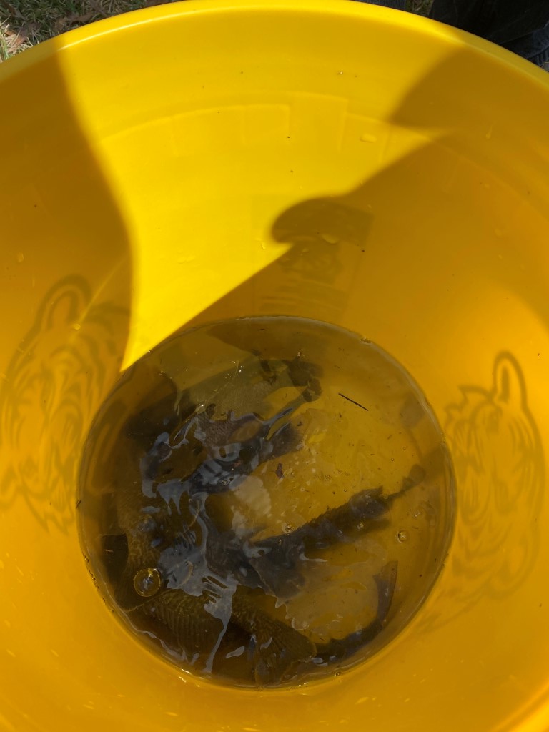 Most of the day was spent down by our pond. Chip and Roy fished, I cheerleaded and several fish were caught. It took a while to catch the 7 small perch and one catfish but they got them!