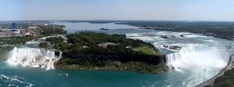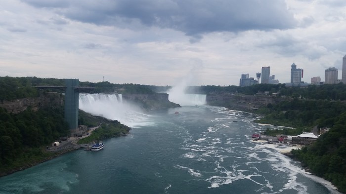 In Canada, the view encompasses all of the falls. There is a 1.25-mile walkway between the Rainbow Bridge where you cross into Canada and the end where the Horseshoe Falls are located.