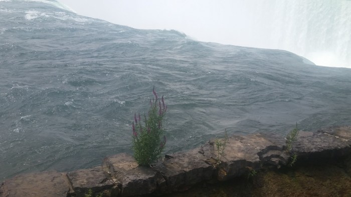 More of the beautiful view looking down on the water that becomes Niagara Falls from a different place. I loved how the common little purple flowers are growing right next to it!