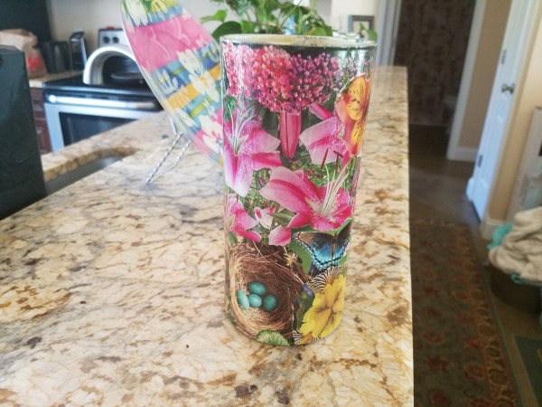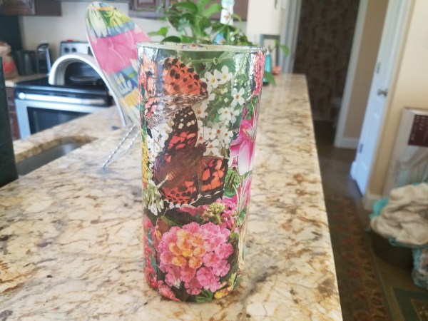 This is another non-wine bottle project. I used pictures of flowers, butterflies and birds that I and my sweet friend Cindy Leblanc gave me of these torn out pictures I painted a vase from Dollar Tree with cream-colored paint in case the magazine cut-outs didn’t cover everything. In the future, I plan to not paint and just make sure there are no uncovered spaces. I used glue on the glass and applied the various pieces to that. You can use the glad wrap method to get everything to stay put without bubbles or wrinkles. I sprayed clear spray over the dried magazine cut-outs a couple of times. I’ve moved from clear spray to polycrylic since I have to go outside for the clear spray and the polycrylic can be done inside with a lot less sticky mess.