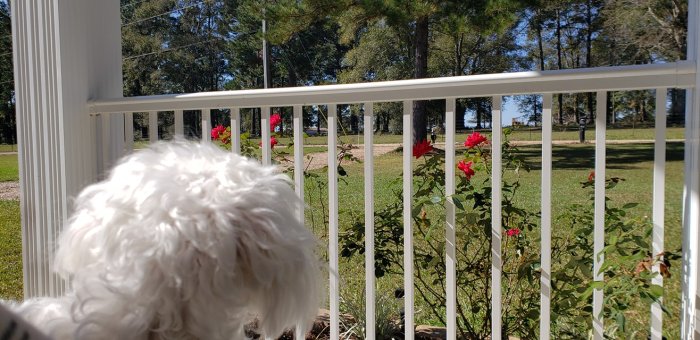 The weather is absolutely beautiful with a light breeze on the porch. Samson took his place on my lap and watched the work closely….! It’s an hour later and they are still working. I love being able to see the beautiful trees and the cows across the street while sitting on the front porch. Roy and I sat there every morning drinking our coffee and visiting. I miss that but life is different now.