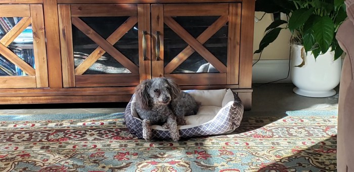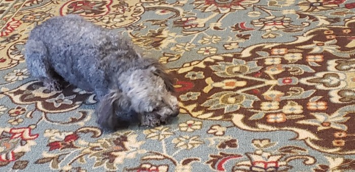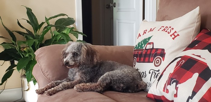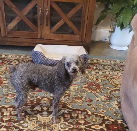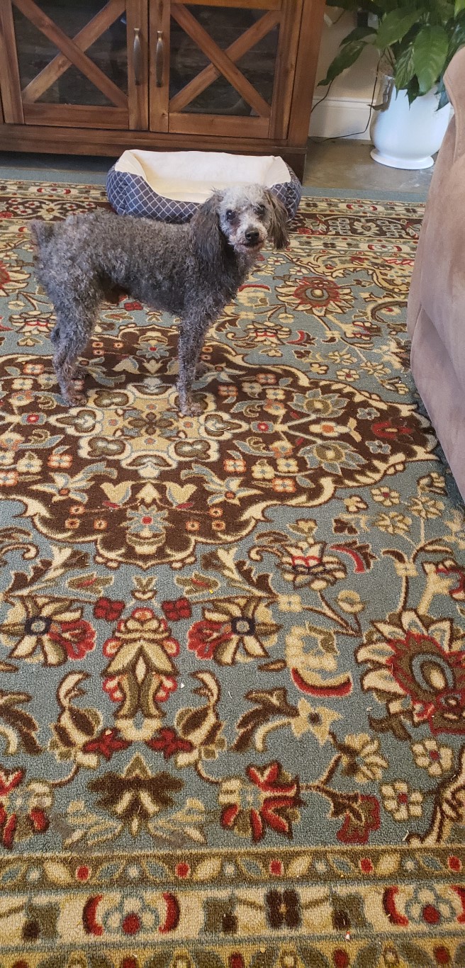 He is so full of energy you wouldn’t think he’s six years old. He follows me everywhere and just stands there and stares at me. He’s really sweet and lets me love on him and is looking forward to his Uncle Chip coming home from work!  He is mostly grey, but you can see his brown hair on his ears and the bottom of his legs in this first photo.